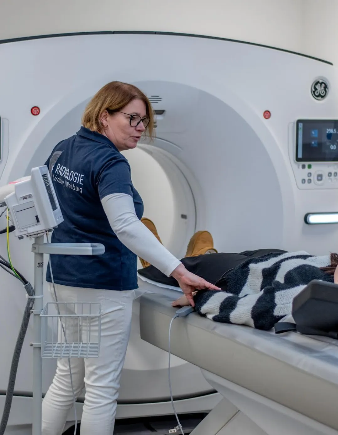 Für die Untersuchung liegen Sie ruhig auf einer fahrbaren Liege, die durch die Öffnung des CT-Geräts bewegt wird. Die eigentliche Bildaufnahme dauert meist nur einen sehr kurzen Moment, die gesamte Untersuchung ist in der Regel nach etwa 5 Minuten abgeschlossen. Damit die Aufnahmen besonders scharf werden, bitten wir Sie je nach Region gelegentlich, kurz den Atem anzuhalten. Unser Team begleitet Sie dabei durchgehend, erklärt jeden Schritt verständlich und sorgt für einen reibungslosen Ablauf.