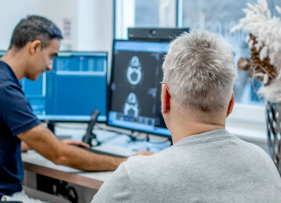 Die eigentliche Bildaufnahme dauert nur wenige Sekunden und ist völlig schmerzfrei. Direkt im Anschluss werden die Bilder ausgewertet. Sie erhalten zeitnah ein persönliches Gespräch, in dem Ihnen die Ergebnisse verständlich erklärt werden. Ihr behandelnder Arzt bekommt einen ausführlichen schriftlichen Befund sowie die Bilddaten, um die weitere Behandlung optimal planen zu können.